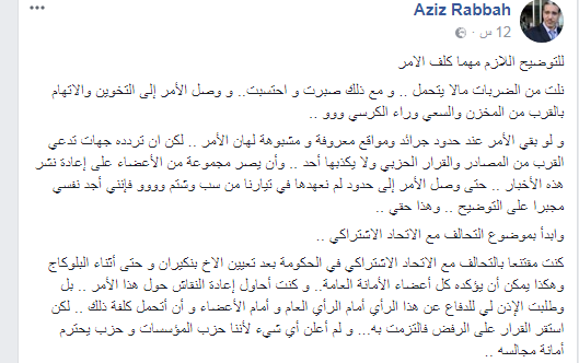 وأضاف وزير الطاقة و المعادن في تدوينة عبر جداره الفيسبوكي ، أن سبب الخلاف يرجع على الخصوص لدخول الإتحاد الإشتراكي للحكومة من عدمه .