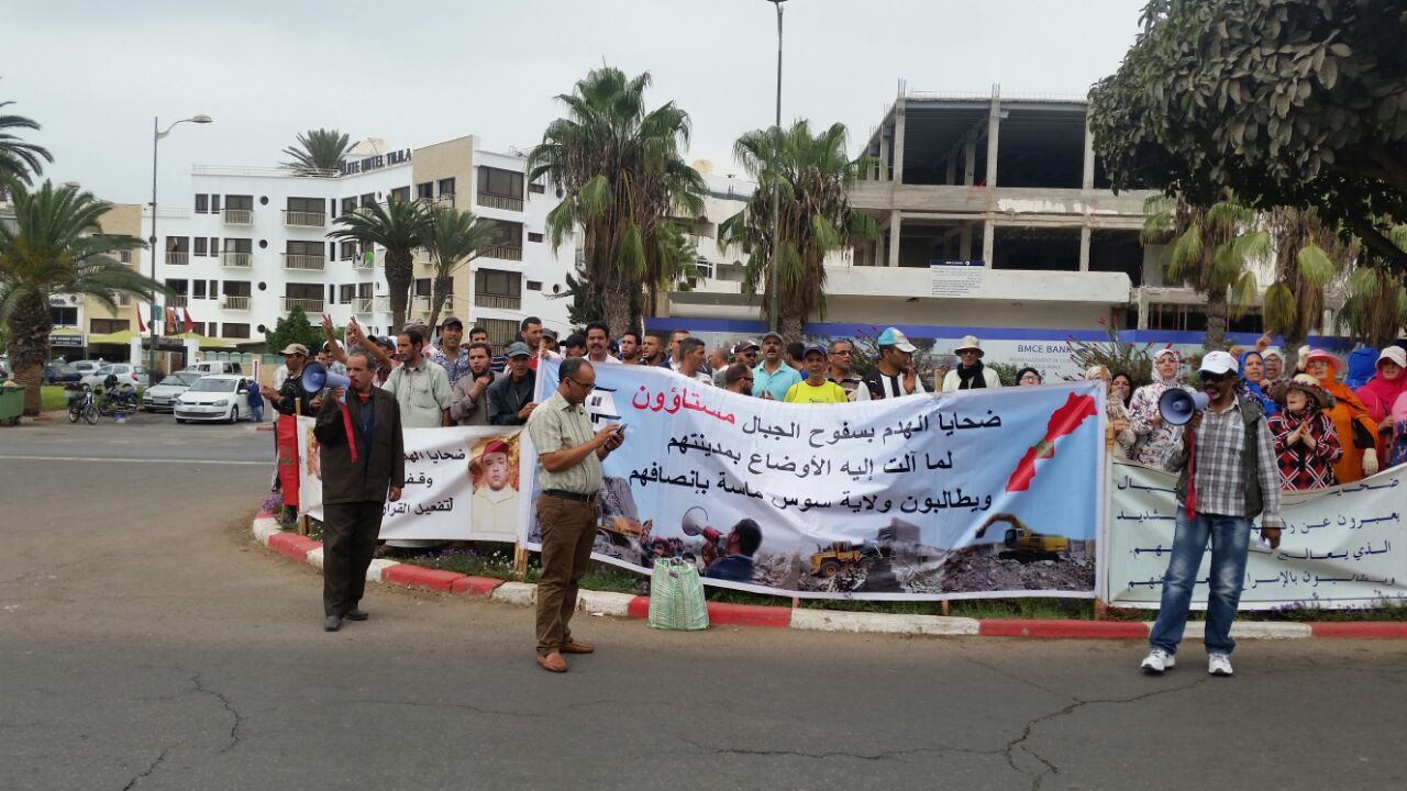 توعد ضحايا سفوح الجبال بأكادير،بتنظيم وقفة احتجاجية صباح يوم الإثنين 23 اكتوبر2017،أمام مقر جهة سوس ماسة،بعدما لاحظوا انعدام الجدية في التعاطي مع ملفهم المطلبي الذي دام أكثر من ست سنوات بعدما تم هدم منازلهم سنة 2012 بدعوى أنها عشوائية.