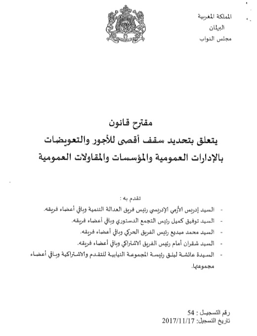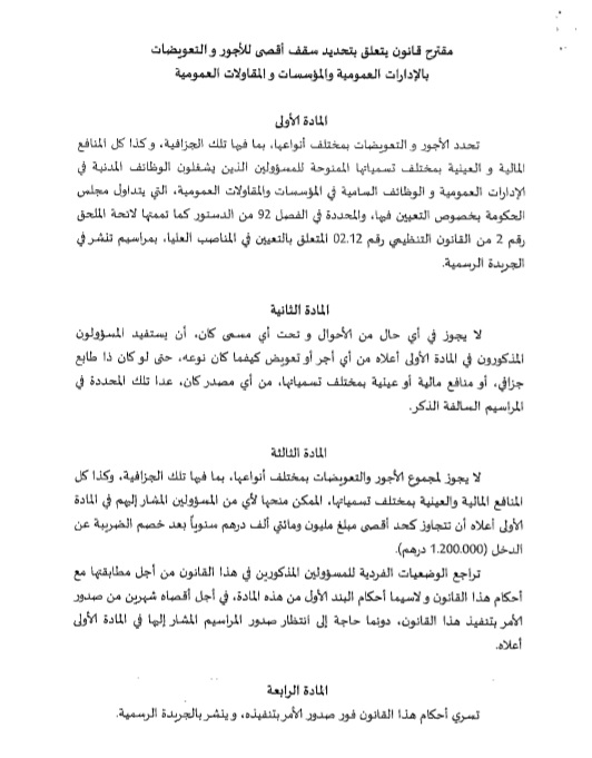 وينص مقترح القانون على تحديد الحد الأقصى لمجموع الأجور والتعويضات بمختلف أنواعها، الممكن منحها للمسؤولين، في مبلغ مليون ومائتي ألف درهم سنويا بعد خصم الضريبة على الدخل، أي 120 مليون سنتيم سنويا.