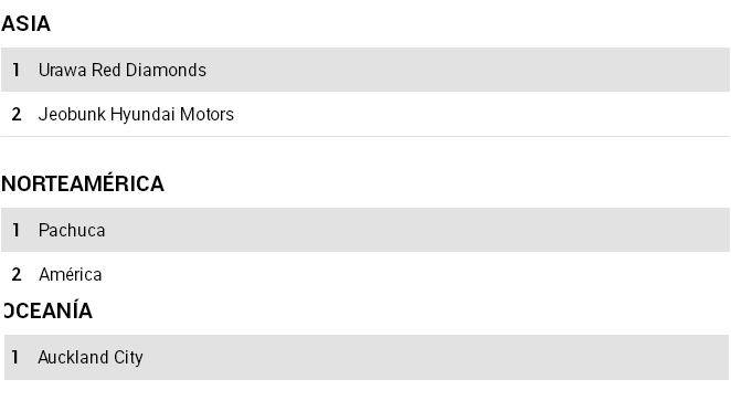 اضافة لذلك سيمثل امريكا الجنوبية 5 اندية وسيمثل افريقيا 2 ناديين واسيا ناديين وامريكا الشمالية ناديين واوقيانوسيا نادي واحد .