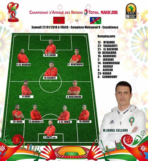 وضع مدرب المنتخب المغربي، جمال السلامي، التشكيلة التالية لخوض مباراة ربع نهائي كأس أمم إفريقيا للمحليين، أمام منتخب ناميبيا: