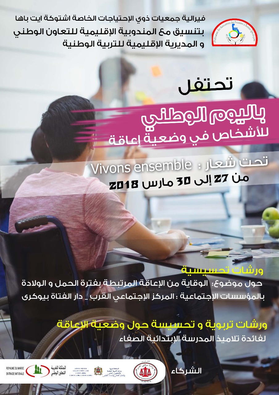 احتفالا باليوم الوطني للاشخاص في وضعية اعاقة الذي يصادف 30 مارس من كل سنة و انفتاحا على المؤسسات التربوية و الاجتماعية تعتزم فيدرالية جمعيات ذوي الاحتياجات الخاصة اشتوكة ايت بها تنظيم لقاءات و انشطة تحسيسية و ذلك بتنسيق مع المندوبية الاقليمية للتعاون الوطني و المديرية الإقليمية للتربية الوطنية في الفترة الممتدة من 27 الى 30مارس خلال الشهر الجاري .