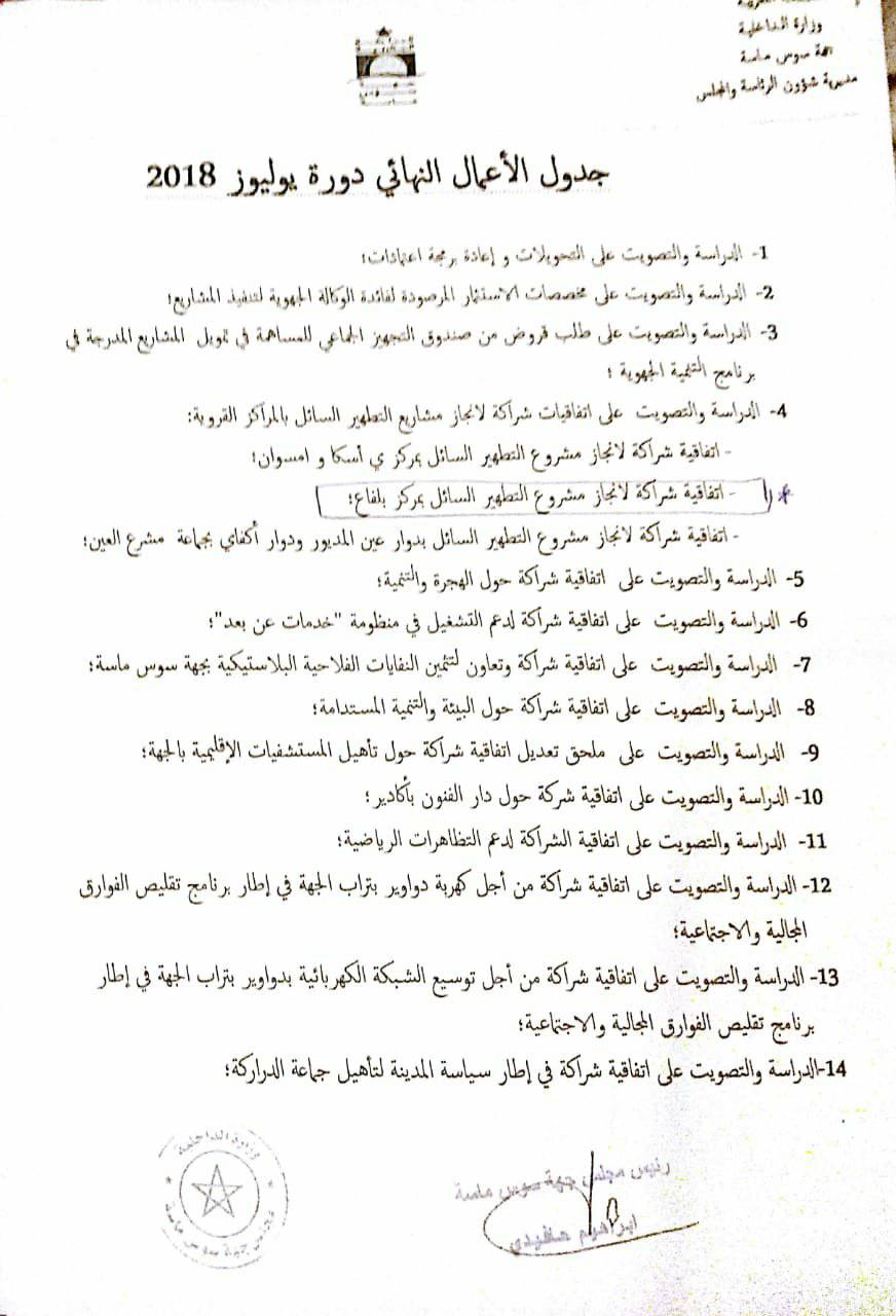 سيعقد مجلس جهة سوس ماسة الدورة العادية لشهر يوليوز 2018 بمقر الجهة و يتضمن جدول أعمال الدورة 14 نقطة من أبرزها: