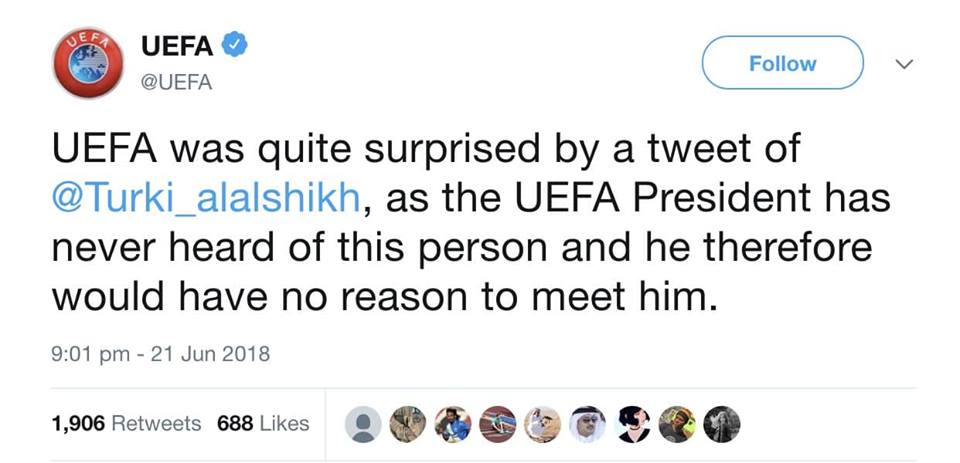 وعبر الاتحاد عبر حسابه الرسمي على تويتر، عن استغرابه، بتغريدة جاء فيها، “لم يسمع رئيس (الاتحاد الأوروبي لكرة القدم) بهذا الشخص بتاتاً من قبل، وبالتالي لا يوجد سبب يدفع للقاء به“.
