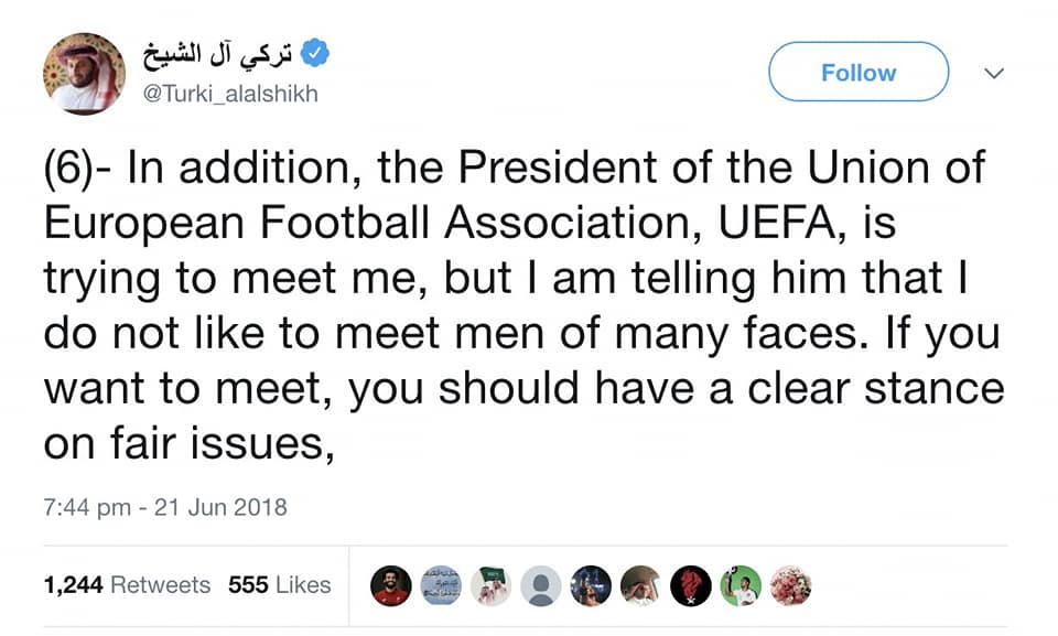 وكان المستشار في الديوان الملكي السعودي أشار في سلسلة تغريدات نشرها عبر حسابه الرسمي على تويتر الخميس، إلى أنه يرفض لقاء رئيس الاتحاد الأوروبي لأنه لا يحب “الرجال المتلونين، إذا أردت اللقاء يجب أن يكون موقفك واضحاً من الاحتكار وتسييس الرياضة“.