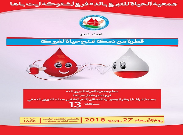 تنظم جمعية الحياة للتبرع بالدم فرع اشتوكة ايت بها، تحت اشراف المركز الجهوي لتحاقن الدم بأكادير، حملة للتبرع بالدم ، في نسختها الثالثة عشر وذلك يوم الاربعاء 27 يونيو الجاري 2018، تحت شعار« قطرة من دمك تمنح الحياة لغيرك » ابتداءً من الساعة الرابعة بعد الزوال ، بالمركب الثقافي سعيد اشتوكة ببيوكرى.