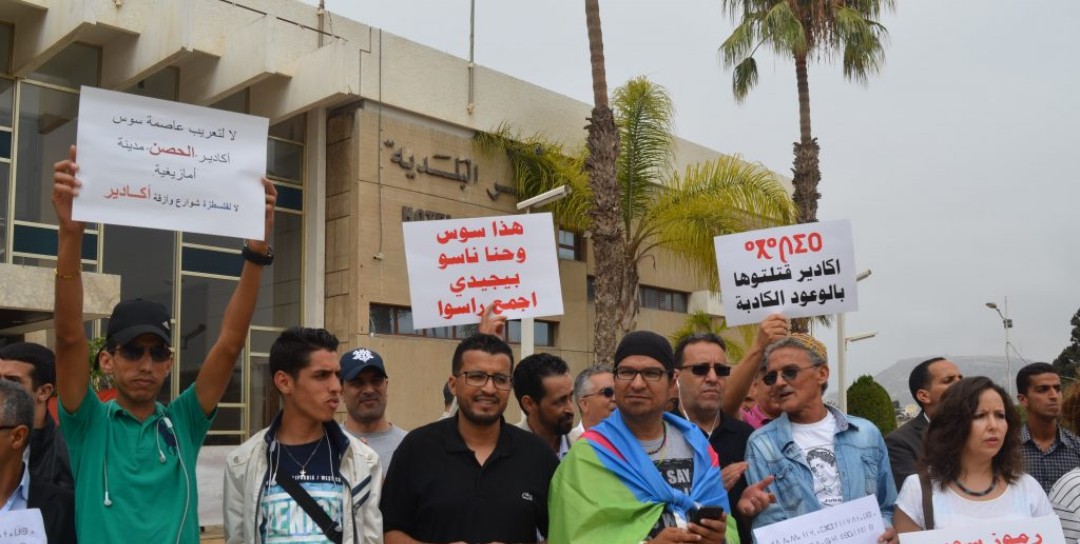 ورفع المحتجون في الوقفة التي دامت زهاء ساعتين الأعلام الأمازيغية، وصدحت حناجرهم بشعارات قوية في وجه المجلس المسير للمدينة، وحملوه مسؤولية محاولة طمس الهوية الثقافية لسوس وأكادير خاصة، وطالبوا من المسؤولين التدخل العاجل لانقاد هوية المدينة من الضياع.