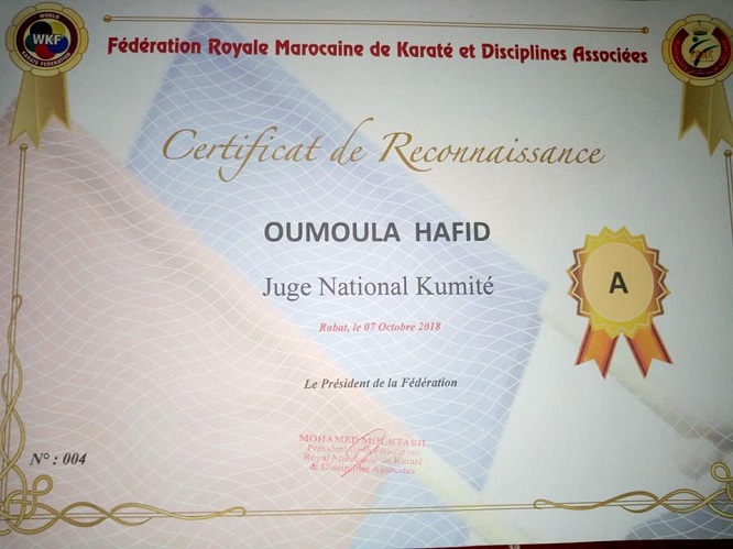 حيث تم ترقيته من حكم B الئ A بعدما نجح في اجتياز الامتحان التطبيقي والكتابي باشرف اللجنة الوطنية للتحكيم ويوصل بذالك مساره الناجح في سعيه للوصل التصنيف الدولی وهو الحاصل علی الحزام الاسود الدرجة التانية ومقبل العام القادم علی الدرجة الثالثة وخبرة تقارب 15 سنة في رياضة الكراطي.