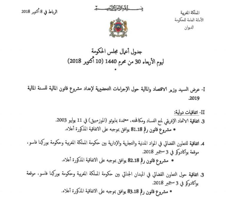 كما ينتظر أن تتم المصادقة على التوجهات الملكية في ميزانية الدولة واعتماد الخطوط الرئيسية لمشروع قانون المالية لعام 2019. والمصادقة على مجموعة من الاتفاقيات الدولية، تتعلق باتفاقية الاتحاد الإفريقي لمنع الفساد ومكافحته، واتفاقيتين للتعاون القضائي بين المغرب وبوركينافاسو، في المواد التجارية والمدنية والإدارية، وفي الميدان الجنائي.