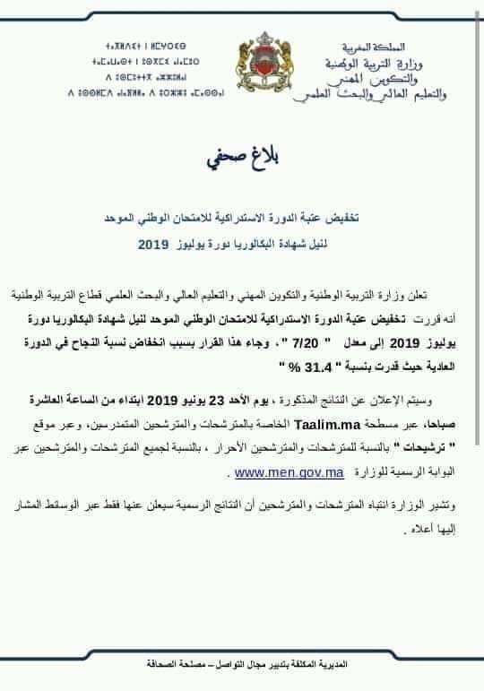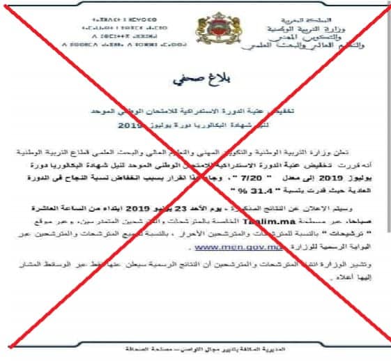 كذبت وزارة التربية الوطنية ما ورد في بلاغ صحفي متداول على مواقع التواصل الاجتماعي بخصوص “تخفيض عتبة الدورة الاستدراكية للامتحان الوطني الموحد لنيل شهادة البكالوريا برسم السنة الدراسية الحالية”.