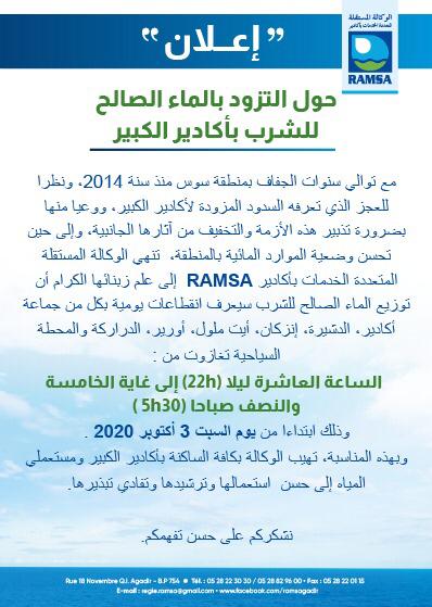 قررت اللجنة الجهوية للماء علـى مستوى عمالة أكادير اداوتنان، اليوم الخميس فاتح أكتوبر الجاري ، خلال اجتماعها المنعقد بمقر العمالة ، أن تزويد ساكنة مدينة أكادير بالماء الصالح للشرب سيعرف انقطاعا يمتد من الساعة العاشرى ليلا (22h00) وإلى غاية الخامسة والنصف صباحا(05h30) ويرجع اتخاذ هذا القرار إلى الوضعية المائية الحرجة التي تستوجب اتخاذ تدابير و إجراءات صارمة و تدعو إلى ضرورة ترشيد الاستهلاك، علما أن أحواض سوس ماسة تسجل عجزا في التساقطات المطرية بنسبة 60 في المائة خلال السنوات الثلاث الأخيرة.