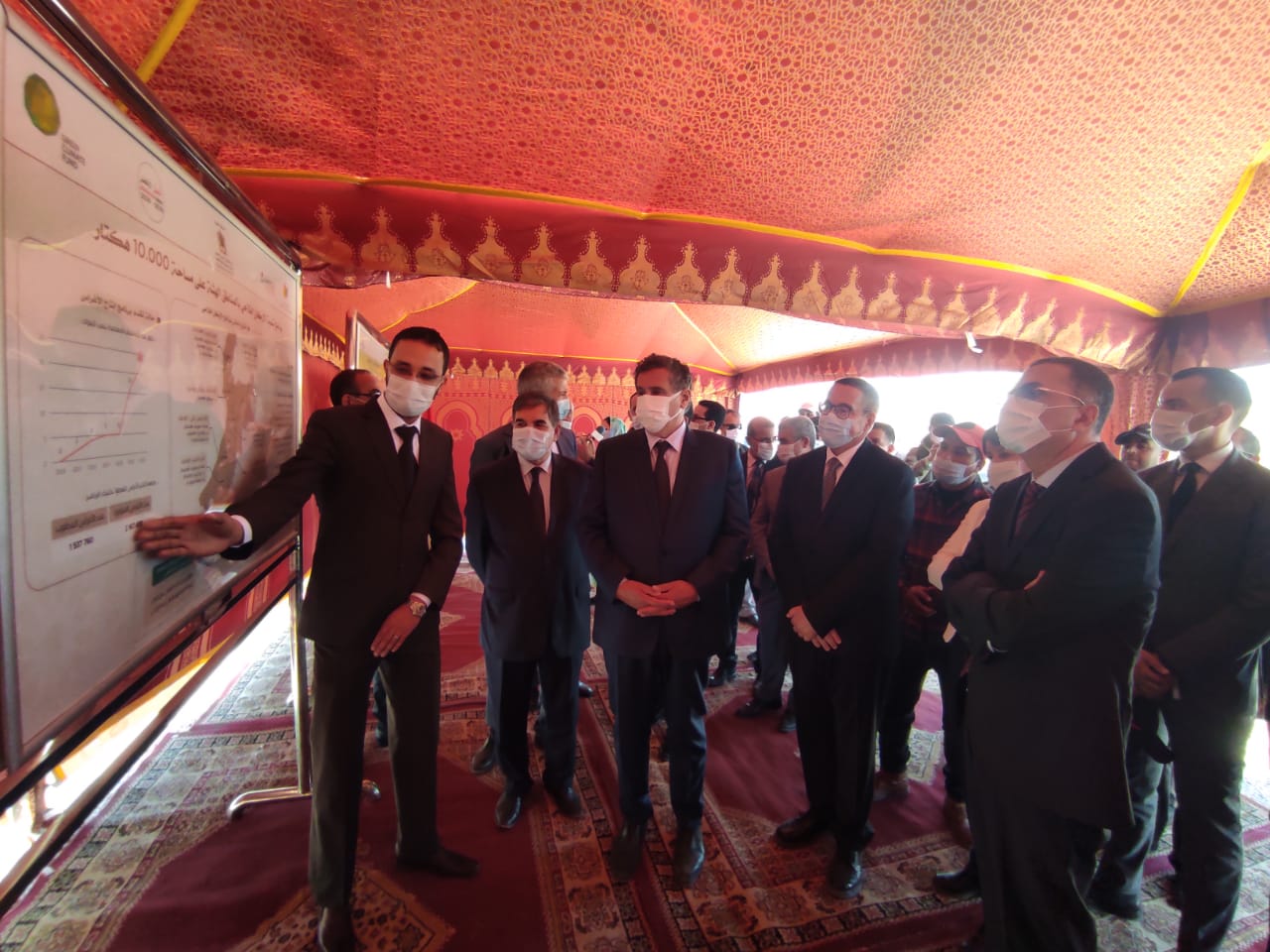 واطلع السيد الوزير رفقة الوفد على تقدم مراحل المشروع التي شارف على مراحله الأخيرة بعد أن تم تمديد عشرات الكيلومترات من الانابيب العملاقة تحت الارض وبناء عدد من المضخات المائية.