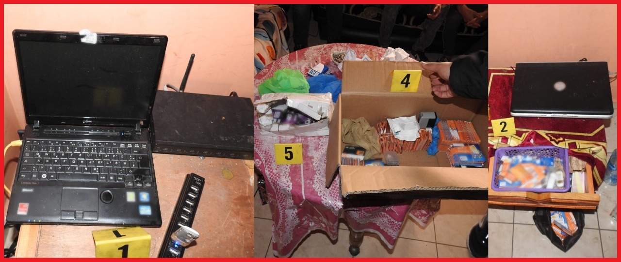 كما أسفرت عمليات التفتيش المنجزة عن حجز 6269 شريحة هاتفية خاصة بمزودي خدمات هاتفية وطنية، وثلاثة حواسيب محمولة ومجموعة من الهواتف النقالة، علاوة على أجهزة إلكترونية ودعامات لتخزين المعطيات المعلوماتية، ومبلغ مالي يشتبه في كونه من عائدات هذا النشاط الإجرامي.