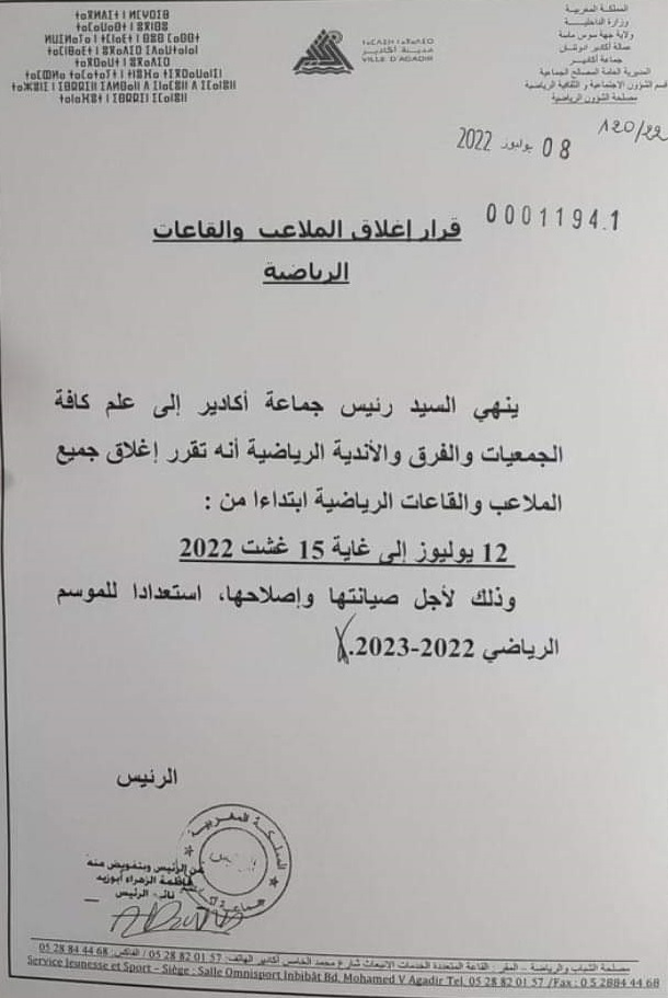 قرر عزيز أخنوش، رئيس المجلس الجماعي لأكادير، إغلاق جميع الملاعب والقاعات الرياضية بالمدينة، إلى غاية 15 غشت القادم.
