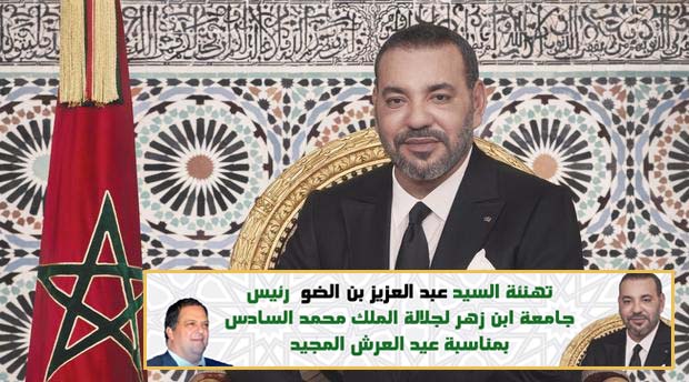 بمناسبة عيد العرش المجيد الذي يخلد هذه السنة الذكرى الثالثة و العشرين لتربع جلالة الملك محمد السادس نصره الله على عرش أسلافه المنعمين، وفي غمرة السعادة التي يعيشها الشعب المغربي بهذه المناسبة الميمونة، يسعد خادم أعتابكم الشريفة: السيد : عبد العزيز بنضو، رئيس جامعة ابن زهر ، وبعد تقديم كل ما يليق بمقامكم العالي من فروض الطاعة والولاء، بتقديم أزكى التهاني وأطيب الأماني لسدتكم العالية بالله، كما نغتنم يا مولاي هذه الفرصة لنرفع إلى مقامكم العالي بالله آيات الولاء والتبريك والإخلاص، مع الدعاء لكم يا مولاي بدوام الصحة والسعادة، لتحققوا للمغرب كل ما يصبو إليه من تقدم ورقي وازدهار.