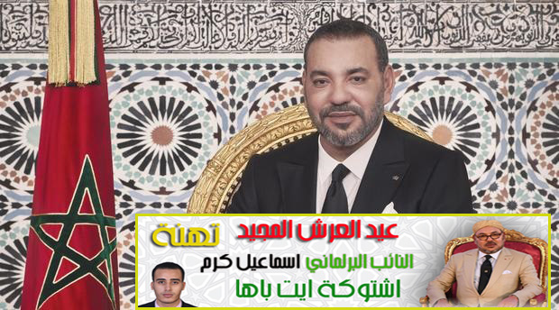 بمناسبة عيد العرش المجيد الذي يخلد هذه السنة الذكرى الثالثة و العشرين لتربع جلالة الملك محمد السادس نصره الله على عرش أسلافه المنعمين، وفي غمرة السعادة التي يعيشها الشعب المغربي بهذه المناسبة الميمونة، يسعد خادم أعتابكم الشريفة: السيد :اسماعيل كرم النائب البرلماني عن اشتوكة ايت باها، وبعد تقديم كل ما يليق بمقامكم العالي من فروض الطاعة والولاء والبيعة ، بتقديم أزكى التهاني وأطيب الأماني لسدتكم العالية بالله، كما نغتنم يا مولاي هذه الفرصة لنرفع إلى مقامكم العالي بالله آيات الولاء والتبريك والإخلاص، مع الدعاء لكم يا مولاي بدوام الصحة والسعادة، لتحققوا للمغرب كل ما يصبو إليه من تقدم ورقي وازدهار.