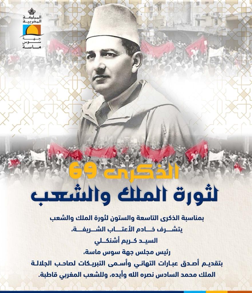 تهنئة من السيد كريم أشنكلي رئيس مجلس جهة سوس ماسة إلى صاحب الجلالة الملك محمد السادس نصره الله وأيده بمناسبة ثورة الملك والشعب نشر في 19 أغسطس 2022 الساعة 23 و 45 دقيقة شارك FacebookWhatsAppTwitterالبريد الإلكترونيLinkedinطباعة تهنئة شارك FacebookWhatsAppTwitterالبريد الإلكترونيLinkedinطباعة