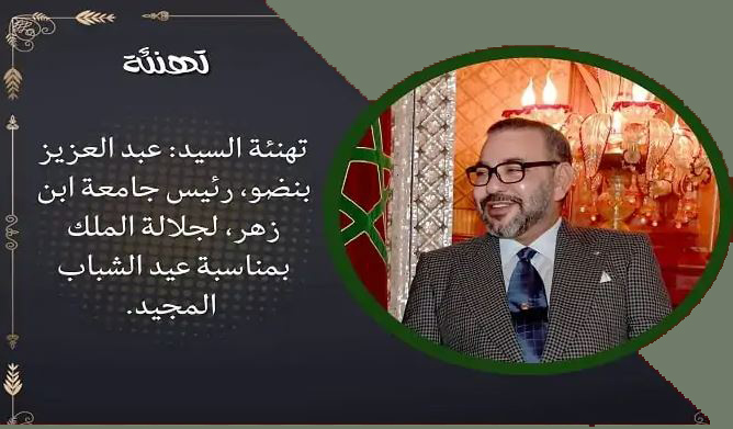 بمناسبة عيد الشباب المجيد، يتقدم السيد عبد العزيز بنضو، رئيس جامعة ابن زهر، بتقديم أطيب الأماني و أزكى عبارات التهاني، مشفوعة بآيات الولاء و الإخلاص و الدعاء لصاحب الجلالة الملك محمد السادس نصره الله و أطال عمره، و بدوام الصحة و السعادة.