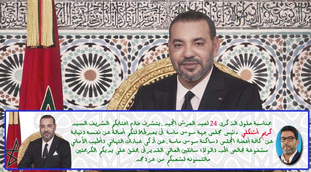 بمناسبة عيد العرش المجيد الذي يخلد هذه السنة الذكرى الرابعة و العشرين لتربع جلالة الملك محمد السادس نصره الله على عرش أسلافه المنعمين، وفي غمرة السعادة التي يعيشها الشعب المغربي بهذه المناسبة الميمونة، يسعد خادم أعتابكم الشريفة: السيد : كريم اشنكلي، رئيس جهة سوس ماسة، وبعد تقديم كل ما يليق بمقامكم العالي من فروض الطاعة والولاء، بتقديم أزكى التهاني وأطيب الأماني لسدتكم العالية بالله، كما نغتنم يا مولاي هذه الفرصة لنرفع إلى مقامكم العالي بالله آيات الولاء والتبريك والإخلاص، مع الدعاء لكم يا مولاي بدوام الصحة والسعادة، لتحققوا للمغرب كل ما يصبو إليه من تقدم ورقي وازدهار.