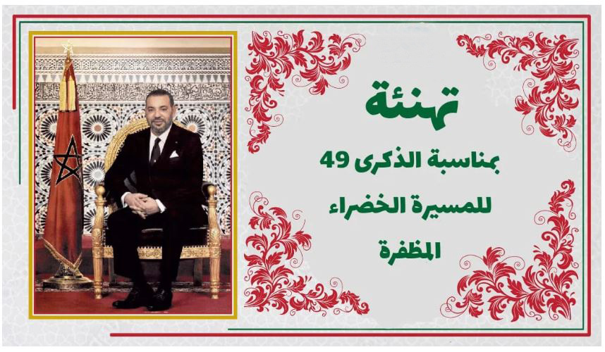 بمناسبة الذكرى 49 لعيد المسيرة الخضراء المظفرة، يتشرف خادم الأعتاب الشريفة، السيد: عبد العزيز بنضو، رئيس جماعة ابن زهر، أصالة عن نفسه ونيابة عن باقي موظفي و مستخدمي الجامعة، بتقديم أحر التهاني وأسمى آيات الولاء والإخلاص لصاحب الجلالة الملك محمد السادس أيده الله ونصره، أبقاه الله ذخرا وملاذا للمغاربة والمغرب وضامنا لرقيه وازدهاره في كافة المجالات الاقتصادية والاجتماعية والثقافية .