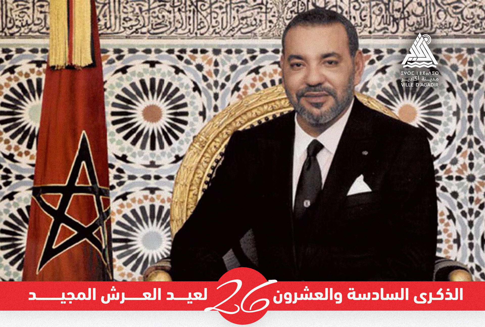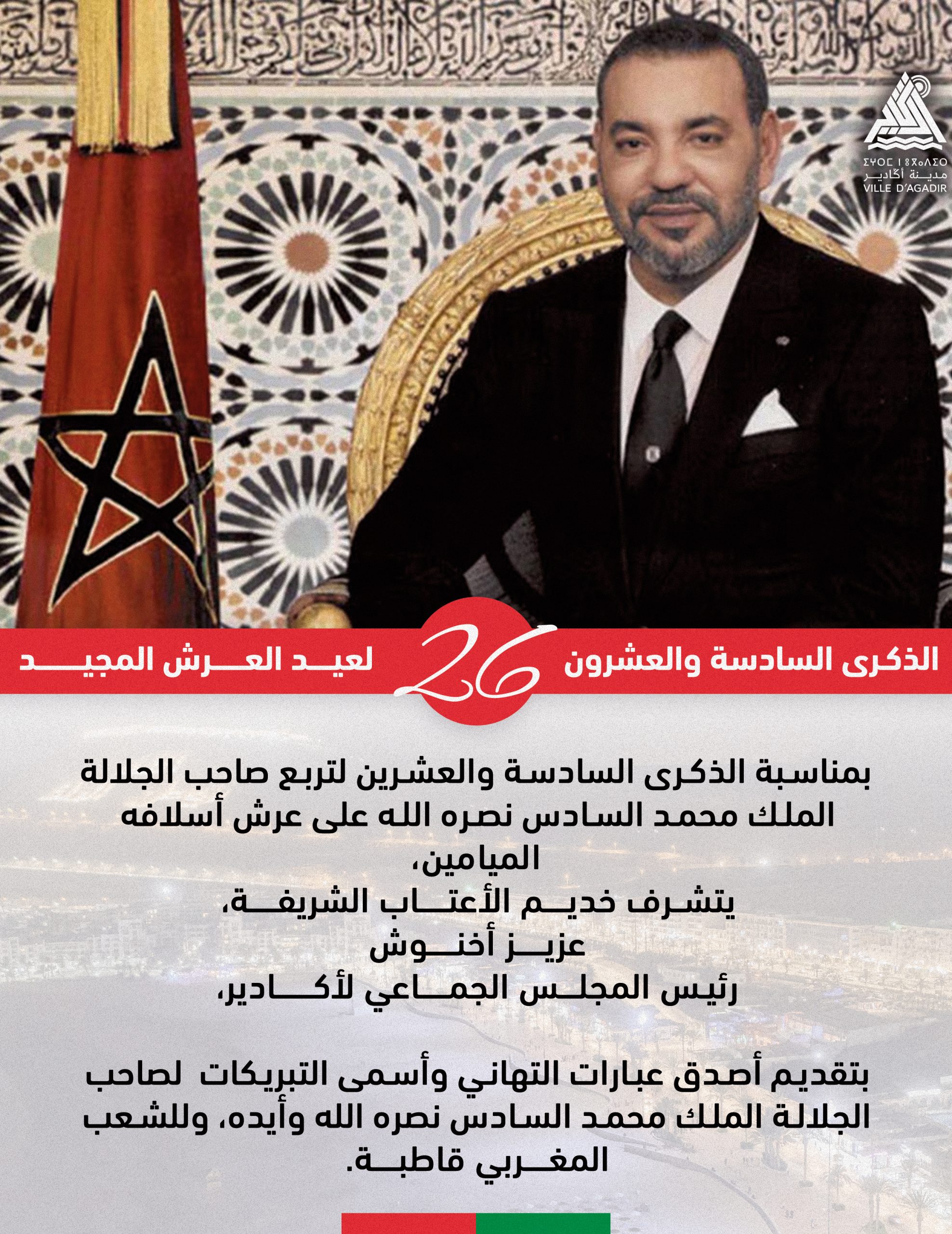 تهنئة السيد عزيز اخنوش رئيس مجلس جماعة اكادير بمناسبة الذكرى 26 لعيد العرش المجيد نشر في 30 يوليو 2025 الساعة 12 و 46 دقيقة شارك FacebookWhatsAppTwitterالبريد الإلكترونيLinkedinطباعة تهنئة شارك FacebookWhatsAppTwitterالبريد الإلكترونيLinkedinطباعة
