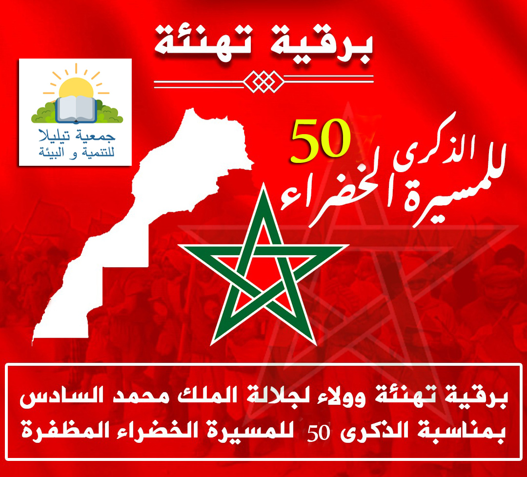“يشرف أعضاء ومنخرطي جمعية تليلا للتنمية والبيئة باكادير، أن نرفع إلى مقامكم العالي بالله، يا مولاي، أسمى آيات الولاء والإخلاص، مقرونة بأحر التهاني بمناسبة الذكرى 50 للمسيرة الخضراء المظفرة ، والتي تزامنت مع القرار الدولي الذي يكرس سيادته على أقاليمه الجنوبية، سائلين المولى عز وجل أن يُديم عليكم نعمة الصحة والعافية، وأن يبارك في جهودكم الدبلوماسية والتنموية الحكيمة لخدمة الوطن ورفعة شأنه بين الأمم.”